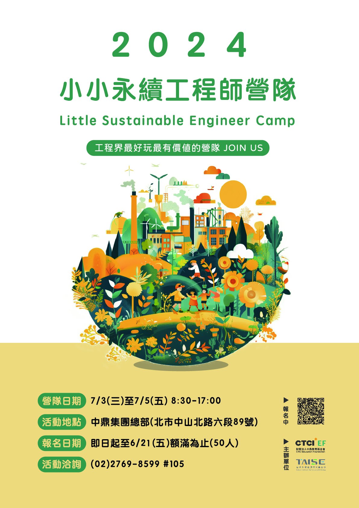| 一、 | 聯合國永續發展目標(SDGs)已是全球政府、教育、企業領域的共通語言,永續發展教育(ESD)與永續發展目標之整合運用係全球最新趨勢。本會主辦「2024小小永續工程師營隊」期能提升國小學童在環境永續、工程領域相關的專業知能,培養其創造力與自主學習力。 |
